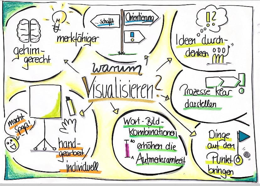 Für mich ist Visualisieren: Neue Themen mit Wort-Bild-Kombinationen aufzuarbeiten, um Kollegen, Mitarbeitern oder auch Kindern Wissen mit Spaß zu vermitteln.